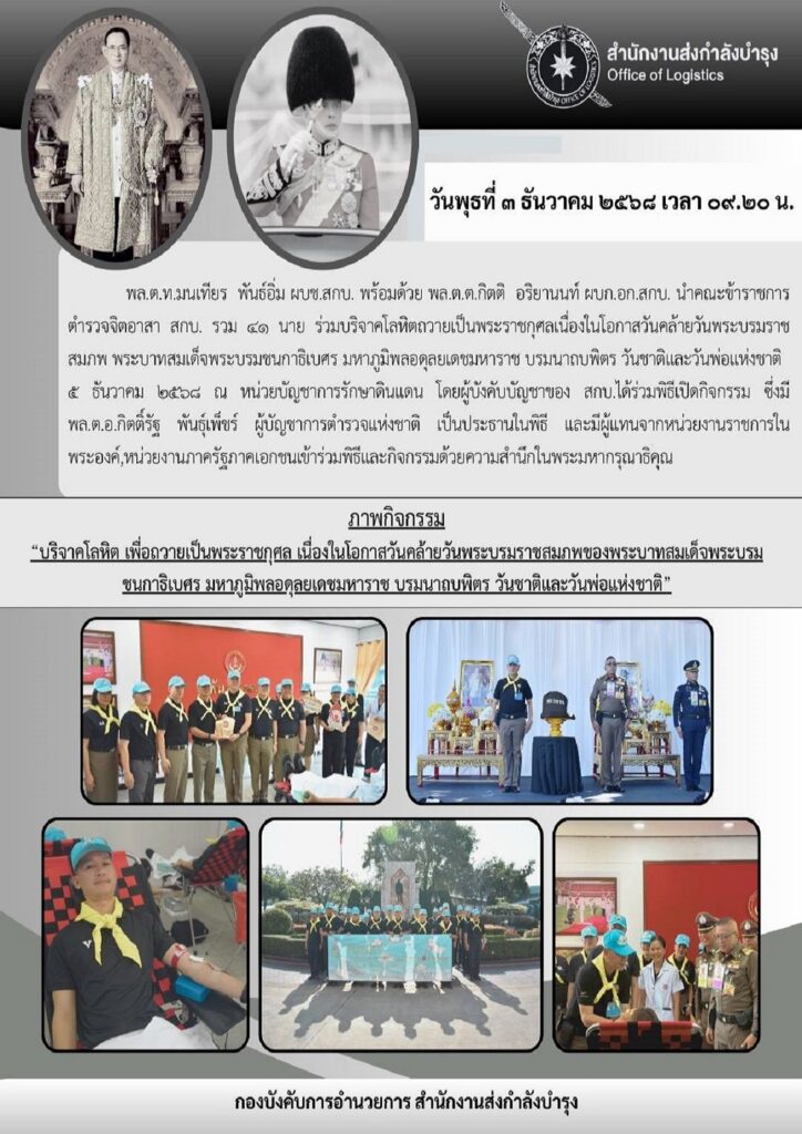 กิจกรรม จิตอาสาร่วมบริจาคโลหิต เพื่อถวายเป็นพระราชกุศล เนื่องในโอกาสวันคล้ายวันพระบรมราชสมภพของพระบาทสมเด็จพระบรมชนกาธิเบศร มหาภูมิพลอดุลยเดชมหาราช บรมนาถบพิตร วันชาติและวันพ่อแห่งชาติ