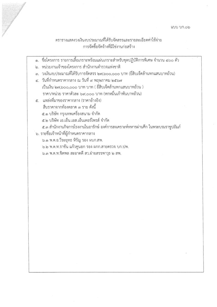 ข้อมุลราคากลางเสื้อเกราะพร้อมแผ่นเกราะสำหรับชุดปฏิบัติการพิเศษ