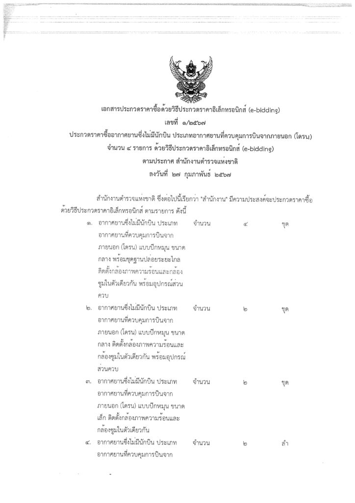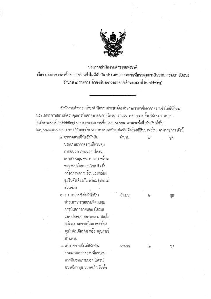 ประกวดราคาอิเล็กทรอนิกส์ (e-bidding) อากาศยานไม่มีนักบิน ประเภทอากาศยานที่ควบคุมการบินจากภายนอก (โดรน)