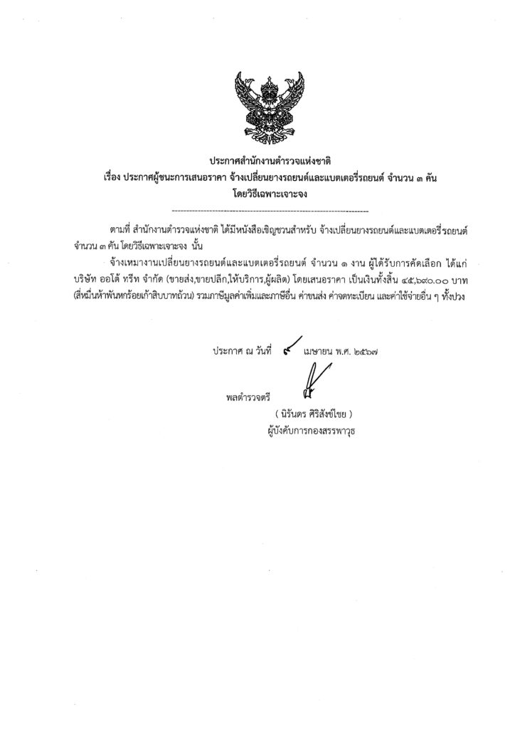 ผุ้ชนะการประกวดราคาเปลี่ยนยางรถยนต์และแบตเตอรี่รถยนต์