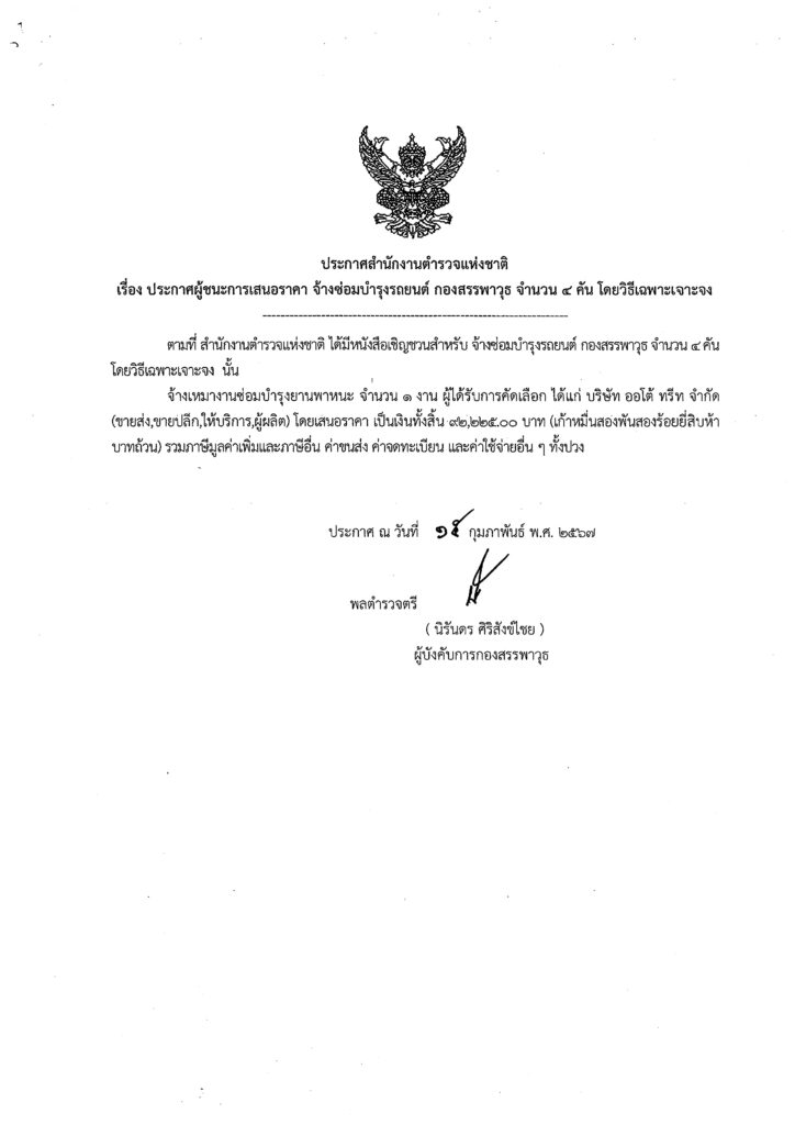ผู้ชนะการเสนอราคาจ้างซ่อมบำรุงรถยนต์ กองสรรพาวุธ จำนวน 4 คัน