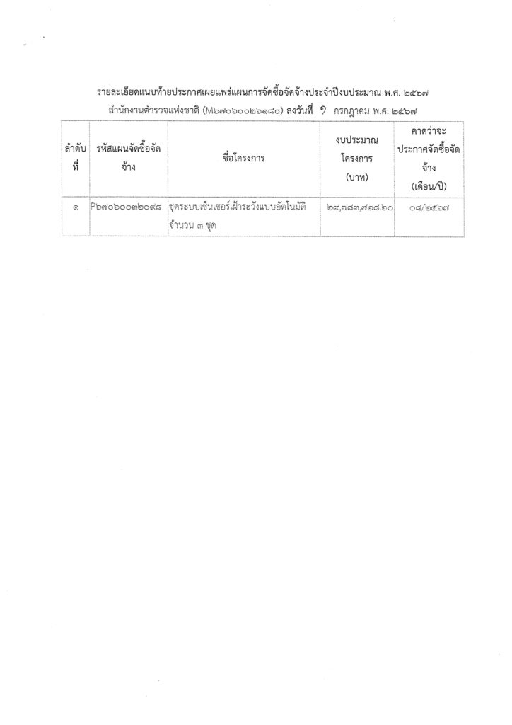 แผนการจัดซื้อจัดจ้างประจำปี พ.ศ. 2567 รายการชุดระบบเซ็นเซอร์เฝ้าระวังแบบอัตโนมัติ