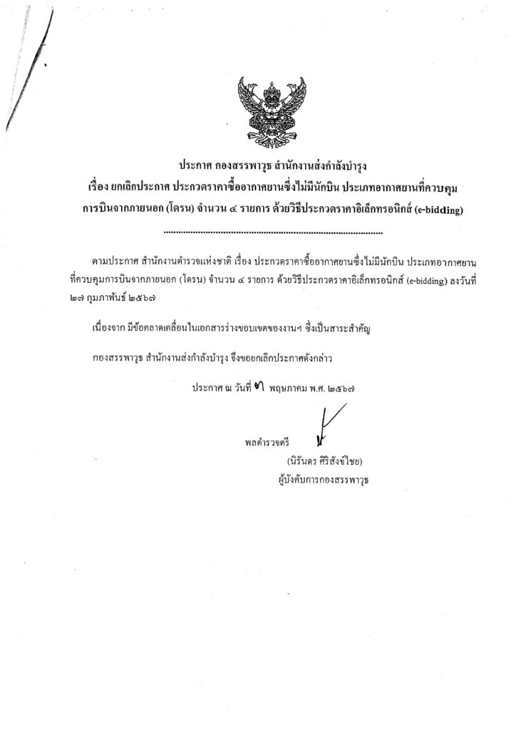 ยกเลิกประกาศประกวดราคาซื้ออากาศยานซึ่งไม่มีนักบินประเภทอากาศยานที่ควบคุมการบินจากภายนอก